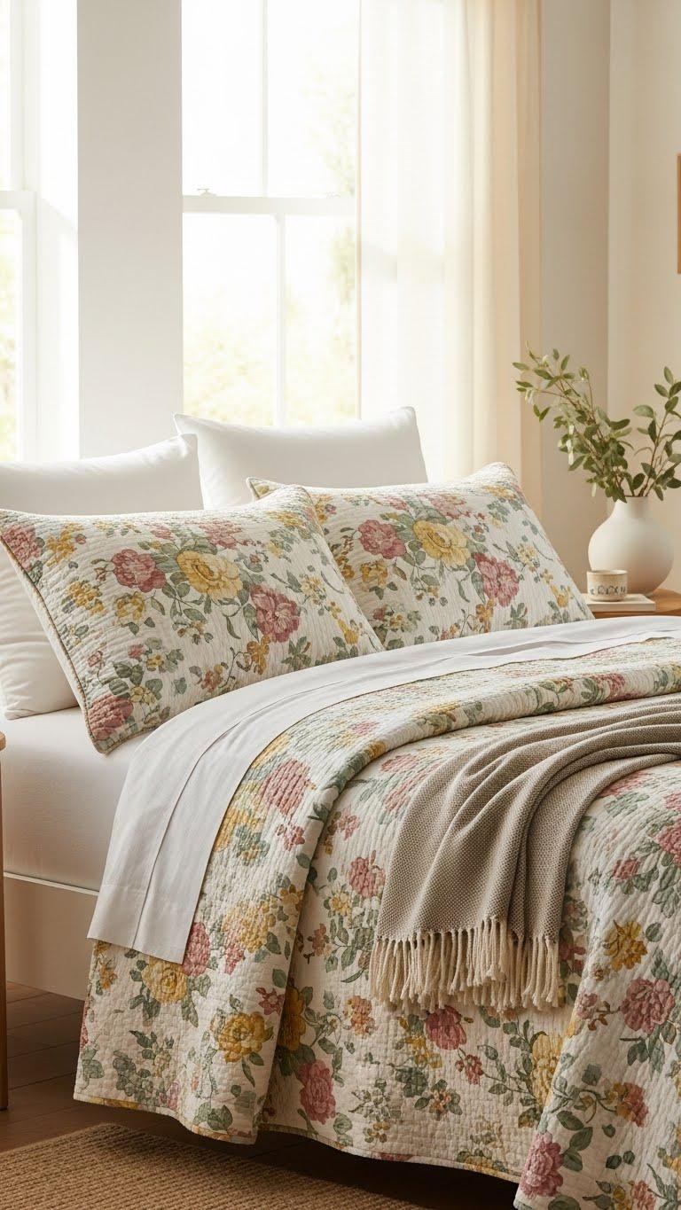 Choose vintage florals in muted hues to add character without cluttering the space. Pair with lightweight shams for airy texture, tuck corners for a crisp look, and mix a neutral throw to keep the scheme free, calm, and effortlessly liberated.