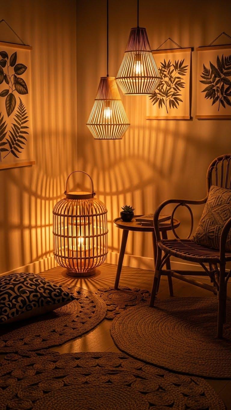 After you’ve laid out botanical prints, bring that organic feel down to eye level with rattan lanterns and bamboo lamps that echo the natural textures on the wall. You’ll cultivate rattan ambiance with layered lighting: place a lantern in a corner, hang bamboo pendants above a reading nook, and choose warm bulbs. The result feels free, grounded, and effortlessly inviting.
