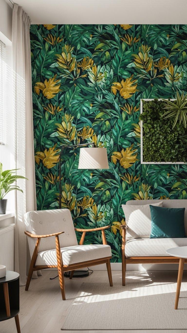 Although a full room refresh can feel intimidating, a bold botanical wallpaper gives you instant personality and depth with minimal effort. Choose vibrant tropical murals or oversized leaf patterns to anchor a living room or bedroom. You’ll balance scale, light, and furniture placement so the wall sings without overpowering. Consider complementing with actual vertical gardening for texture and a liberating, fresh vibe.