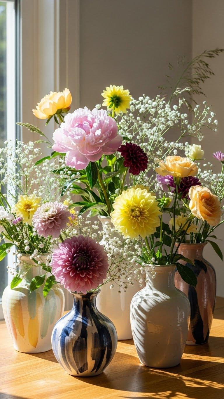 Bring seasonal blooms together in hand-painted vases to give your room an immediate, personal lift—mixing color, scale, and texture so the arrangement looks effortless, not fussy. You’ll trim painted stems at varied lengths, cluster focal flowers with airy fillers, and rotate vase placement for light balance. Choose confident, unforced combos that honor movement and space, letting each bouquet feel free and intentional.