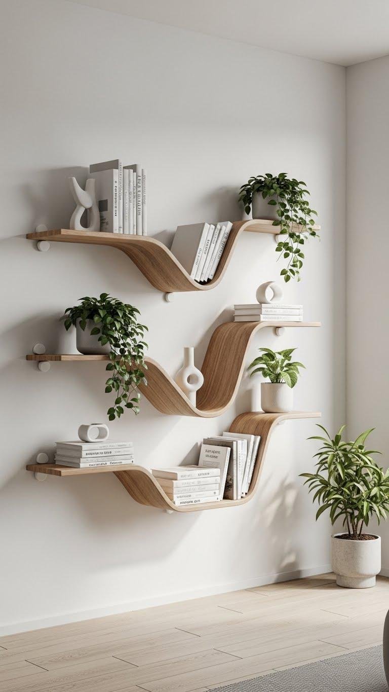 Mount with floating brackets and reliable ceramic anchors for a clean, airy effect. Keep styling minimal but personal, letting negative space and flowing forms invite movement and freedom throughout your room.