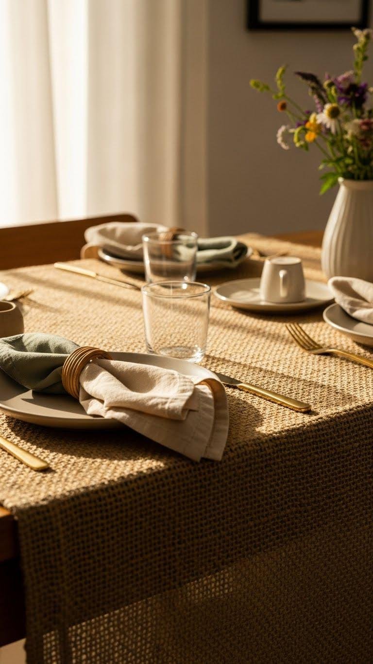 Choose a jute tablecloth for tactile warmth on your dining surface and pair it with soft, reusable bamboo napkins for effortless refinement.