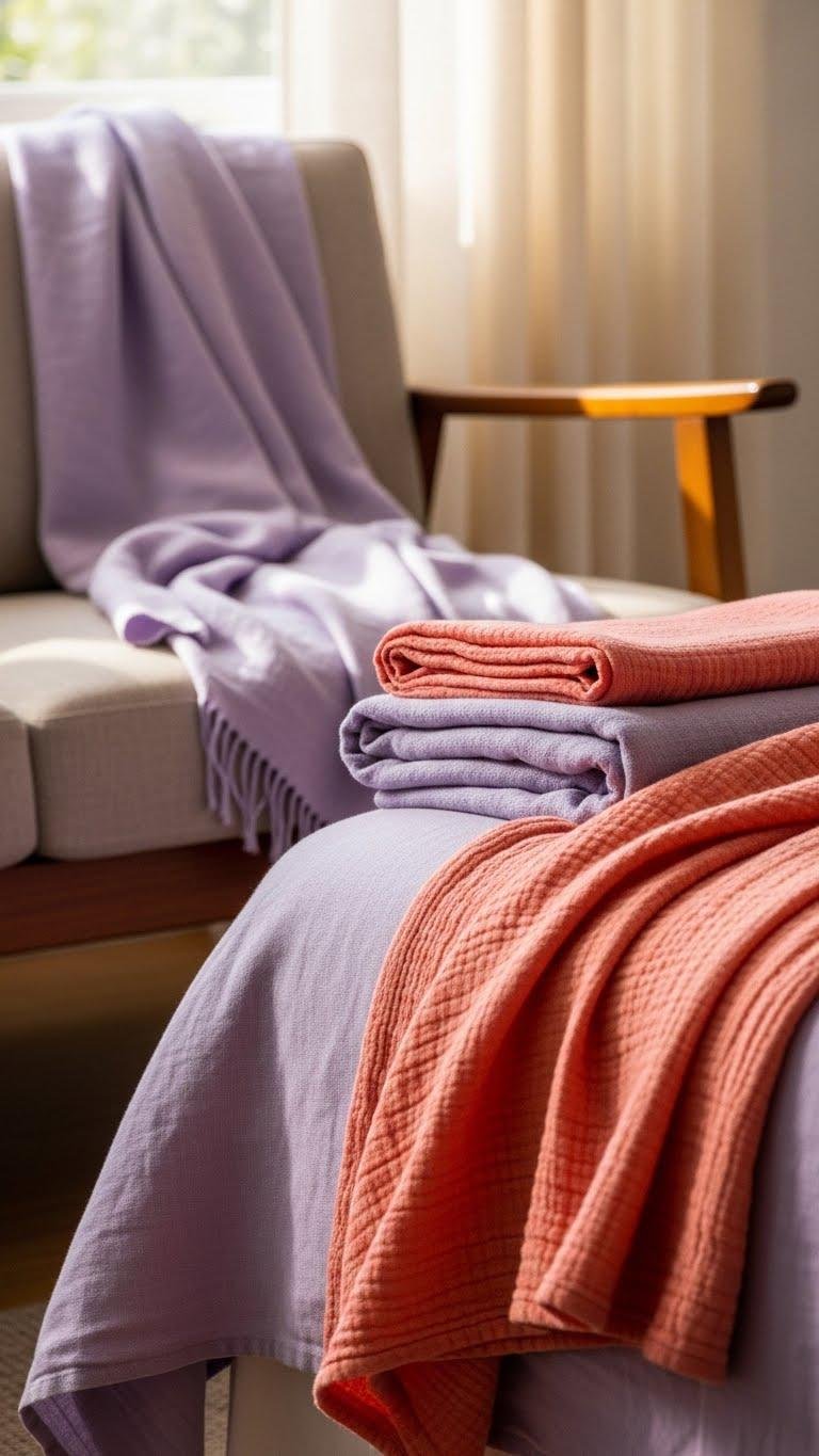 Layer soft blankets and throws in lavender and coral to give your room an instant mood lift and usable warmth—drape a lightweight lavender linen throw over the back of a sofa and fold a coral cotton blanket at the foot of the bed for a polished, lived-in look.