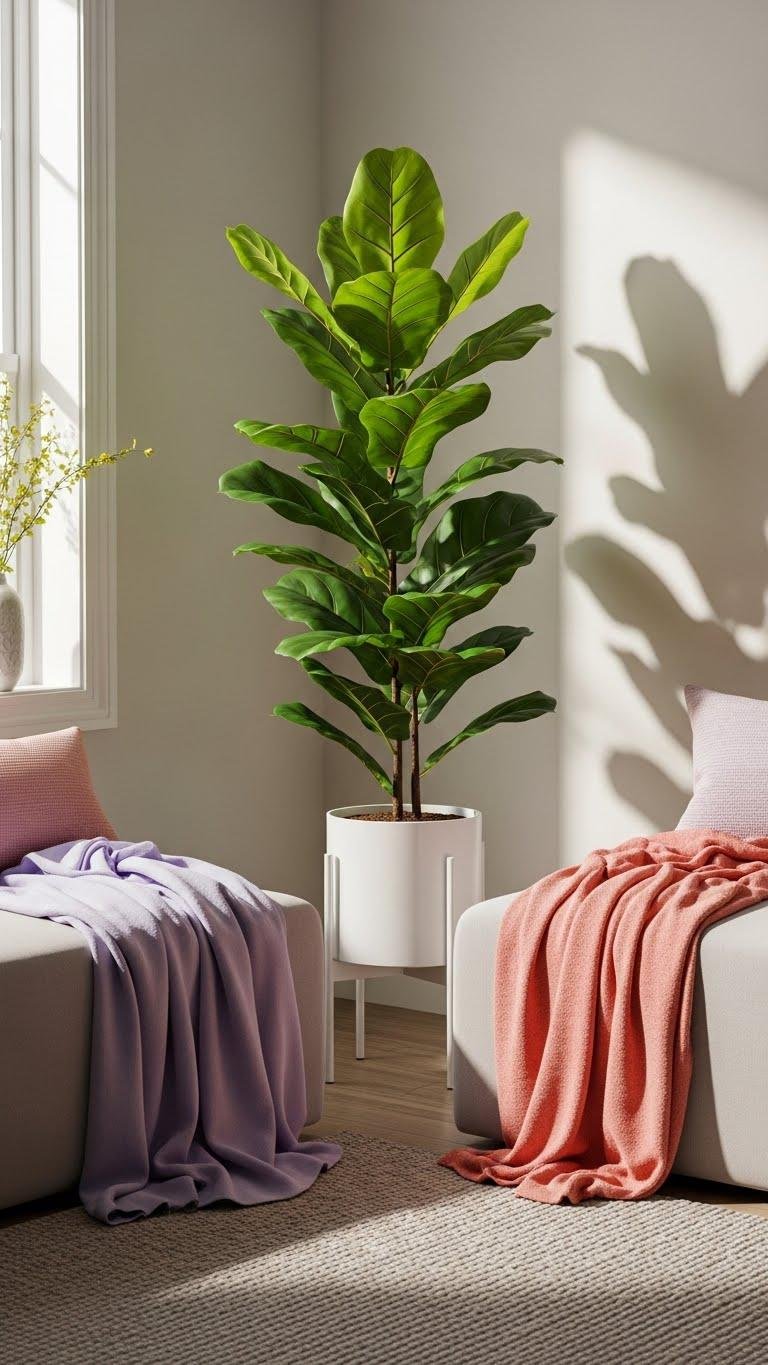You’ll choose a Fiddle Leaf or Banana plant for bold leaves and instant elevation. Position on a simple stand, rotate for even light, and let that corner become a freeing focal point that breathes life and height into your space.
