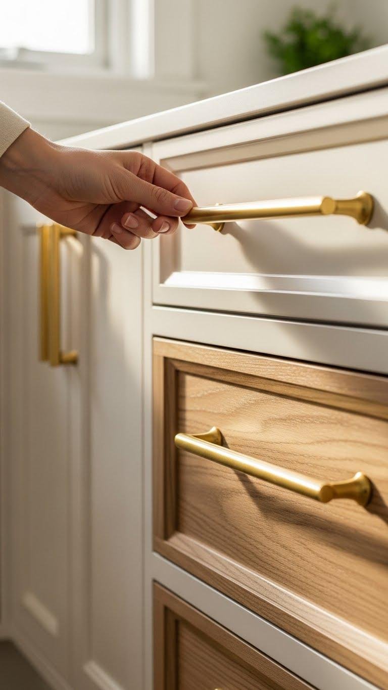Swap mismatched pieces for streamlined brass knobs, choose matte or polished finishes to match lighting, and balance warm pulls across cabinets. You’ll gain a cohesive, liberated aesthetic that’s practical, refined, and effortlessly modern.