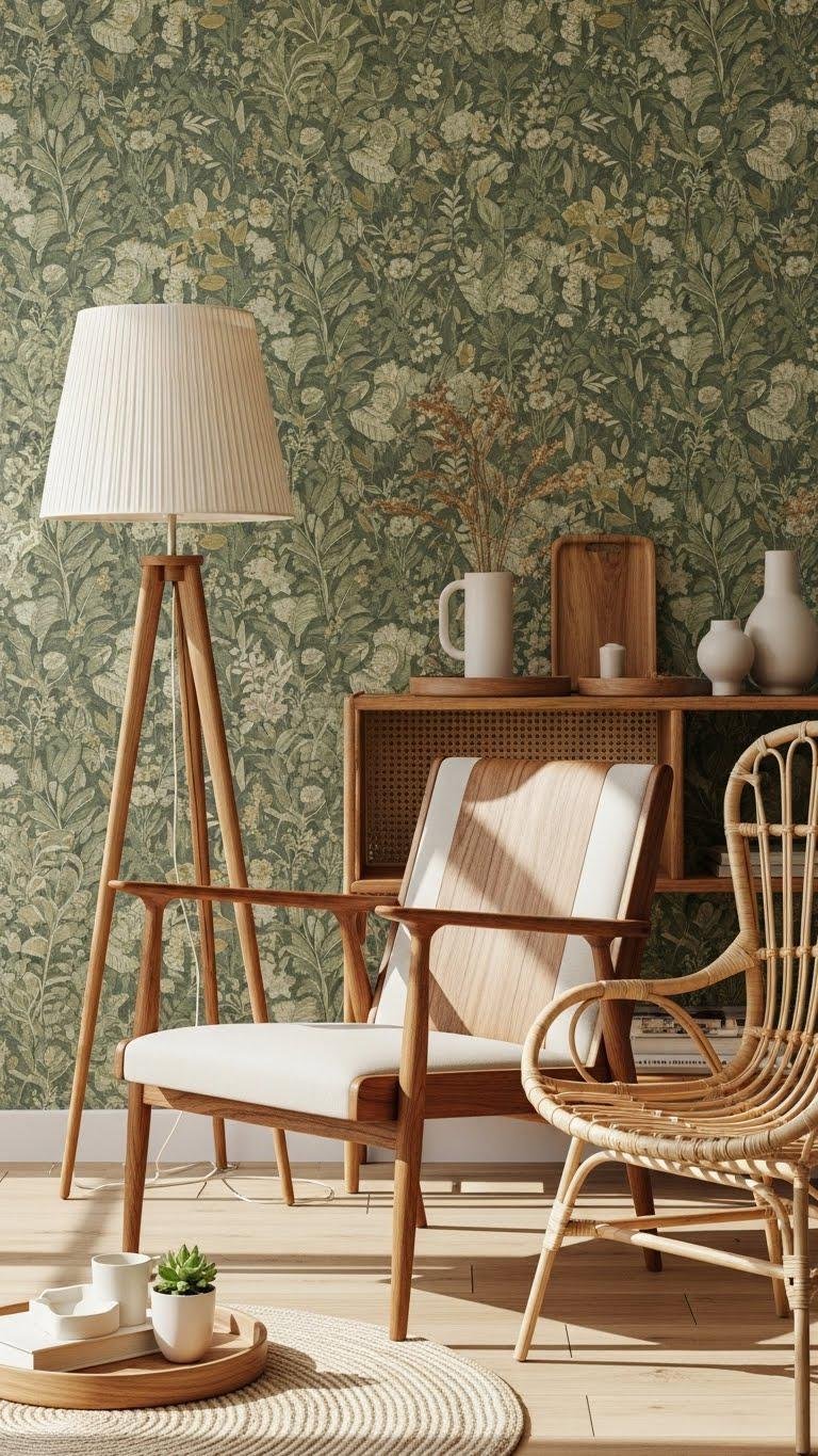 Layer natural wood and rattan pieces into your space to instantly soften a bold botanical backdrop and introduce tactile warmth.
