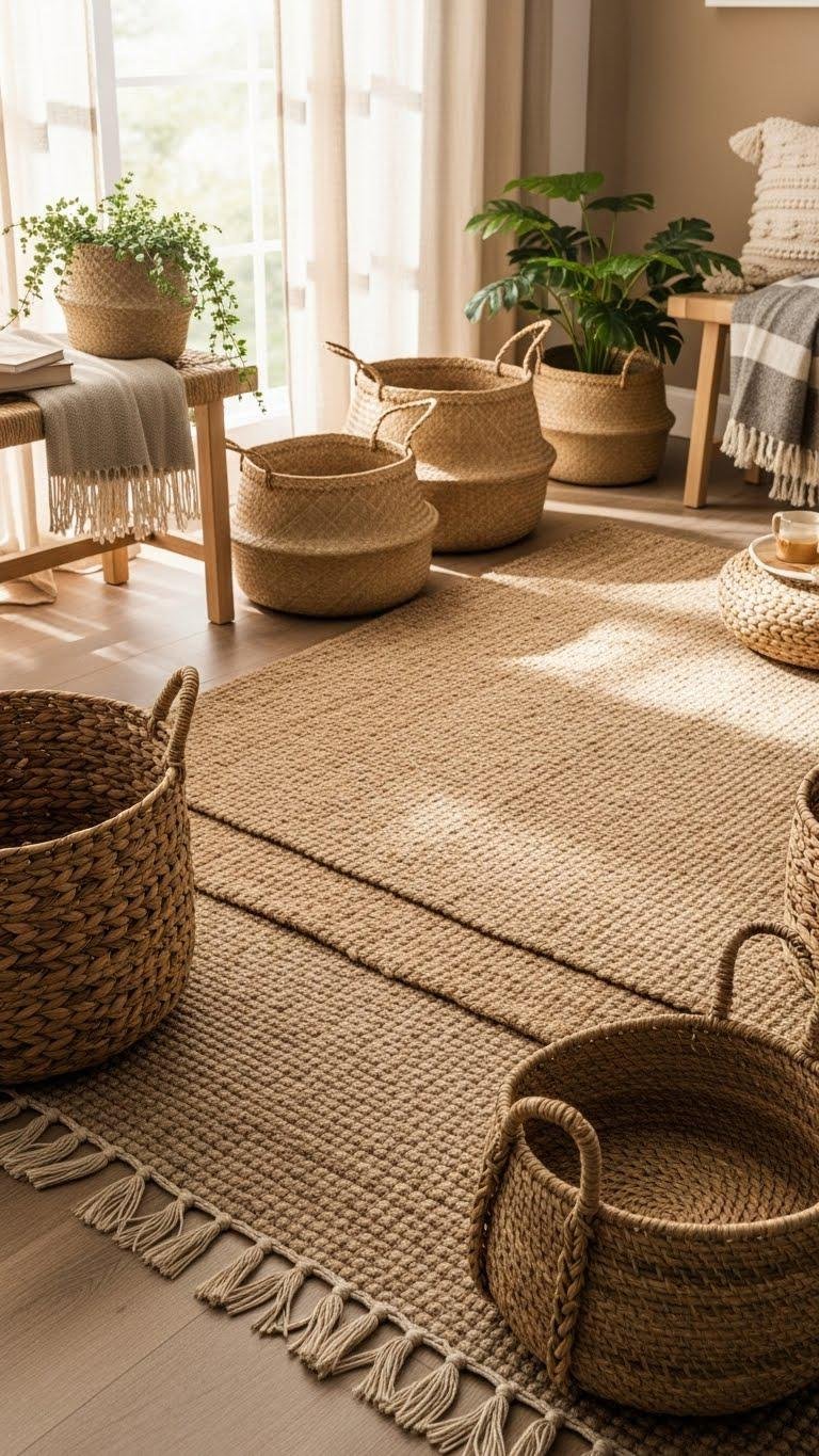 Often you’ll find that a simple jute rug and a few woven baskets are the quickest way to ground a room and add tactile interest; they anchor seating areas, soften hardwood floors, and create practical storage without fuss. Choose handmade jute pieces for authenticity, layer rugs for texture contrast, and tuck baskets near benches or plants so you can move, refresh, and live freely with effortless style.