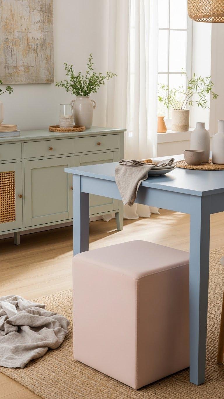 Give a fresh spin to your space by painting a key piece—think a sideboard, dresser, or dining table—in sage, blush, or powder blue; these muted hues bring a soft, modern calm that pairs beautifully with natural textures. You’ll refresh rooms without overwhelming them: consider sage cabinetry for a serene kitchen and a blush ottoman to add gentle contrast, using durable paint and satin finishes for longevity.