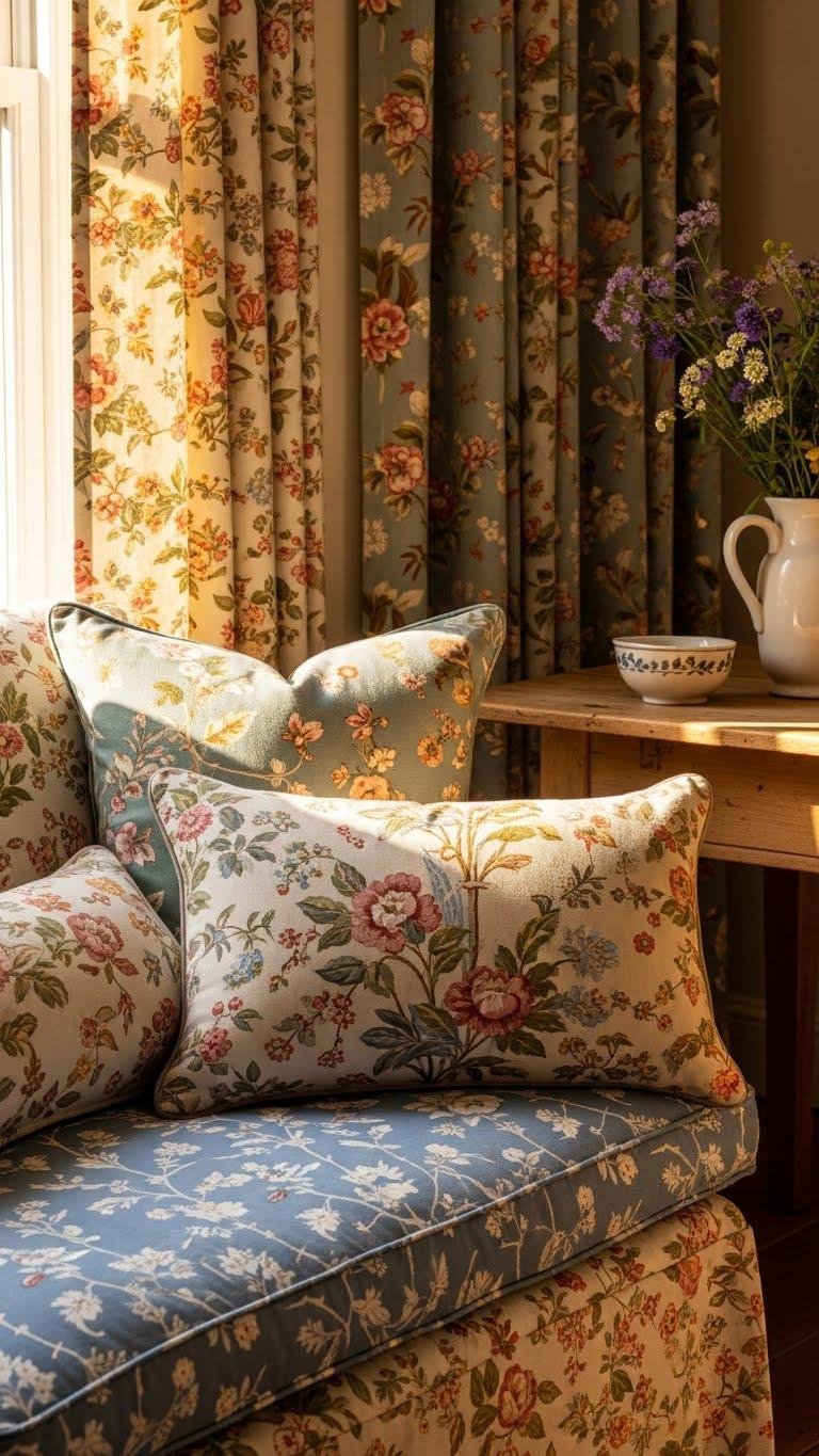 Think of vintage floral fabrics as your palette for cottagecore charm: start by pairing small-scale ditsy prints with larger botanical motifs so each pattern reads clearly from both near and far. You’ll mix chintz layering with linen textures, rotate heirloom prints on cushions and curtains, and keep color stories restrained. This lets you create a free, lived-in cottage look that feels intentional.