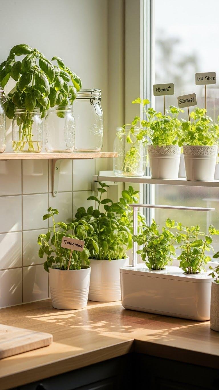 Bring fresh flavor into your kitchen by carving out a tiny herb corner that’s equal parts useful and beautiful. You’ll create a micro herb lab on a sunny sill or slim shelf, mixing mason jars and sleek pots. Try countertop hydroponics for effortless growth, minimalist labels, and snip-as-you-go freedom. It’s practical, stylish, and lets you cook with bright, immediate herbs.