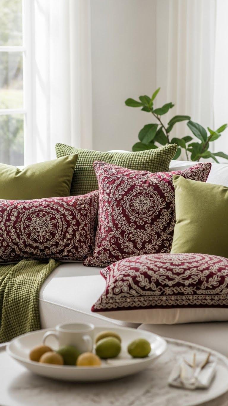 Once you’ve lightened the room with multi-functional furniture, layer in olive and maroon accent pillows to add warmth and depth without overwhelming the airy feel. Choose textured velvet for cozy contrast and patterned embroidery for artisanal flair.