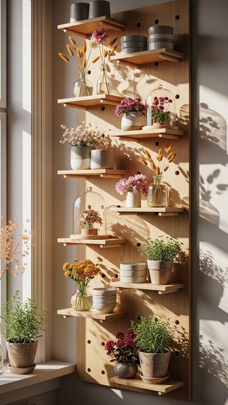 Install peg shelves to display seasonal blooms and swap them out as the mood shifts — they’re an easy way to keep your space looking curated without overcommitting.