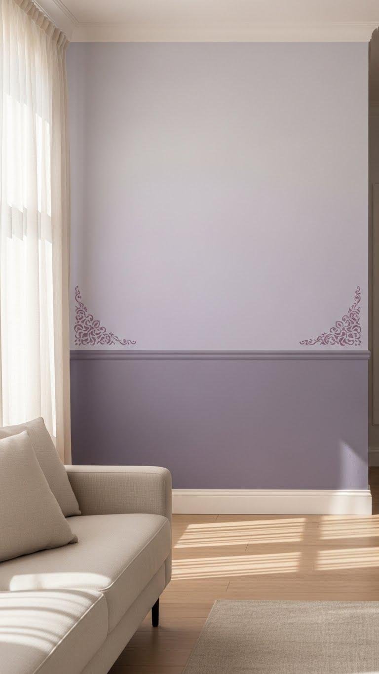 Brighten up your room by painting a single wall in soft lilac—its muted purple brings a modern, calm energy without overwhelming the space. Choose a lavender ombre for depth, fading from pale to richer tone, then add subtle mauve stenciling near corners or a chair rail for texture. You’ll create an airy, free-feeling focal point that’s stylish, soothing, and effortlessly fresh.