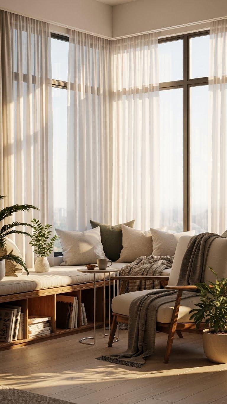 Once your plant corner brings in fresh life, let the windows play along by swapping heavy drapes for sheer, light‑filtering curtains. You’ll choose linen sheers for breezy texture or thermal sheers to balance light with energy sense. Soft panels lift mood, blur edges, and keep rooms airy. Install simple rods, embrace neutral tones, and let sunlight feel free and intentional.