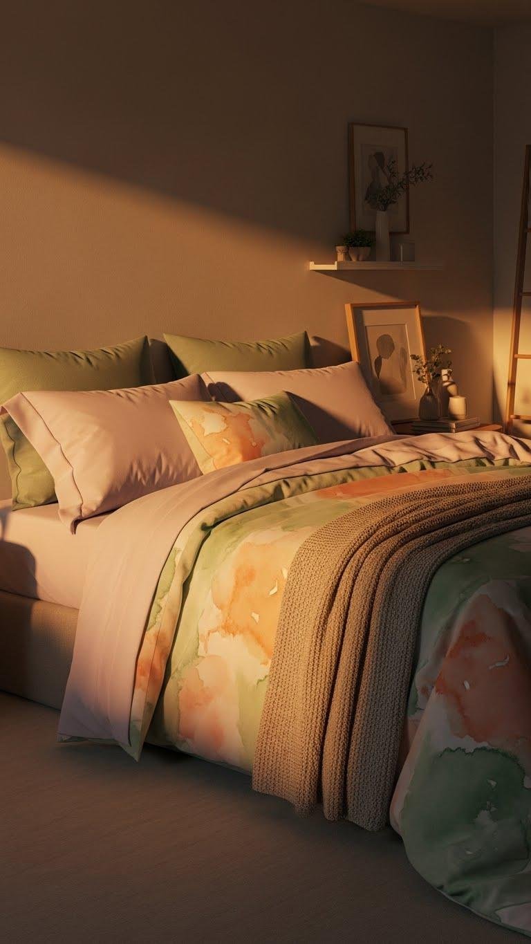 After you’ve layered warm lighting to set the mood, soften the room with bedroom linens in watercolor pastels that echo those amber tones. Choose a watercolor duvet with airy washes of peach and sage, pair crisp pastel pillowcases, and let textures breathe. You’ll create a calm, liberated retreat that feels modern, effortless, and ready for slow mornings and spontaneous escapes.