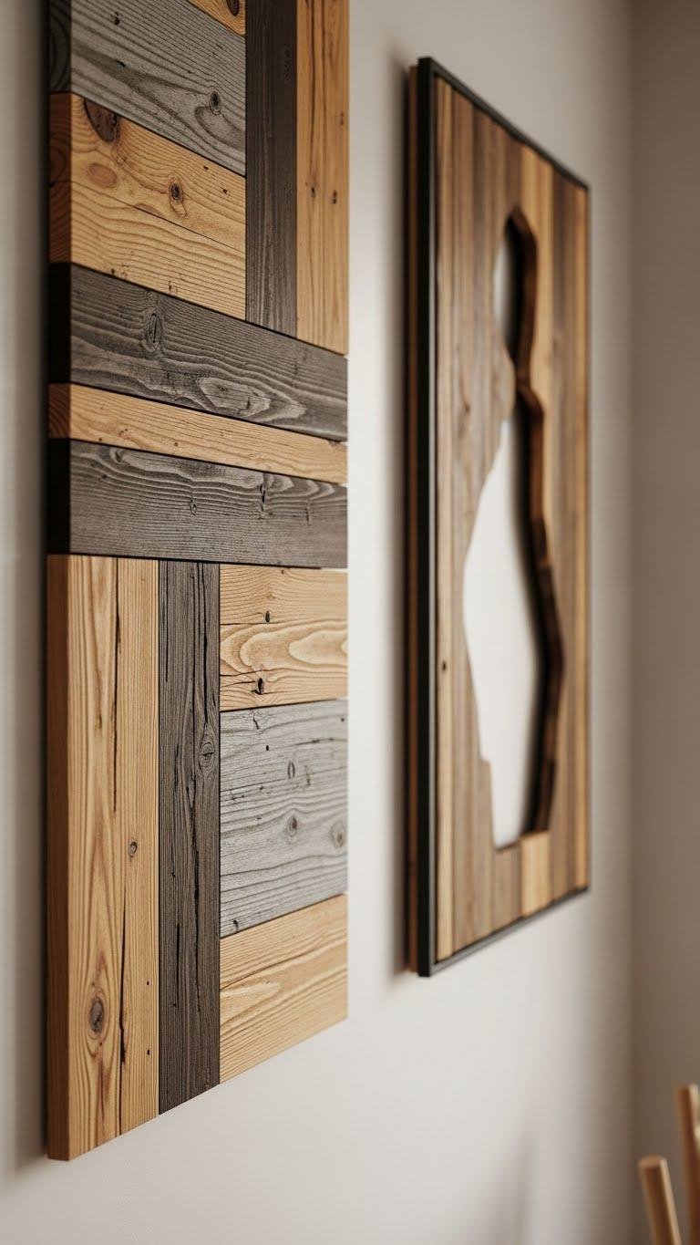 If you’ve cleared clutter with hidden bench storage, repurposing reclaimed wood into wall art keeps that clean, calm vibe while adding texture and character. You’ll craft a rustic silhouette or merge reclaimed boards into bold geometric panels, staining selectively for contrast.