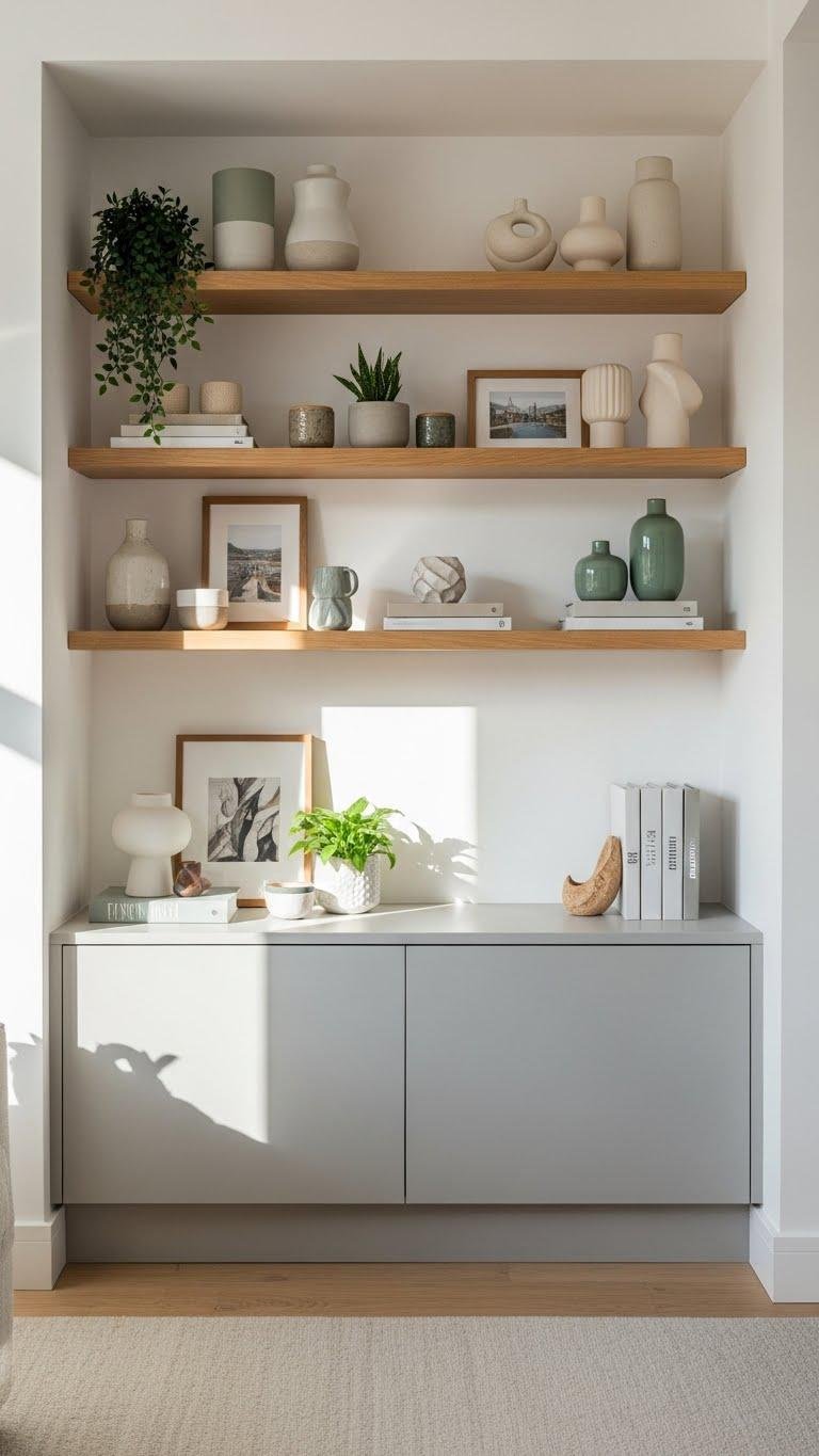 You’ll showcase ceramics, plants, and travel finds on open shelving while hidden closed storage below holds paperwork, gadgets, and bulk items. It’s a breezy, practical upgrade that frees your space and mind.