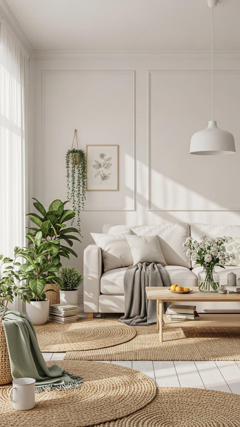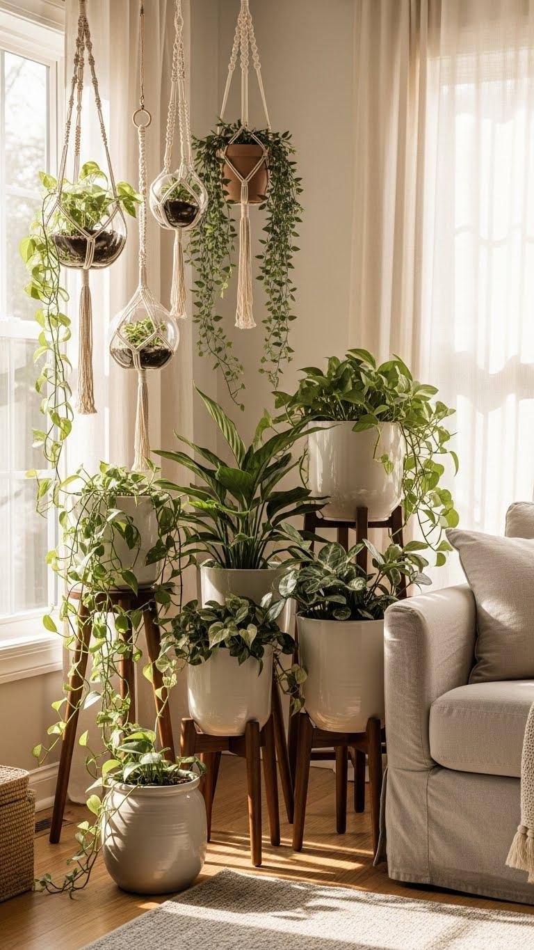 Those soft linen throws set a relaxed tone—now bring the room to life by arranging plants at varying heights to create a natural, layered look. Mix hanging terrariums with floor pots and staggered plantstands to add movement and airy depth. Choose lightweight pots and trailing vines for freedom of arrangement, rotate pieces seasonally, and keep pathways clear for a breezy, lived-in vibe.