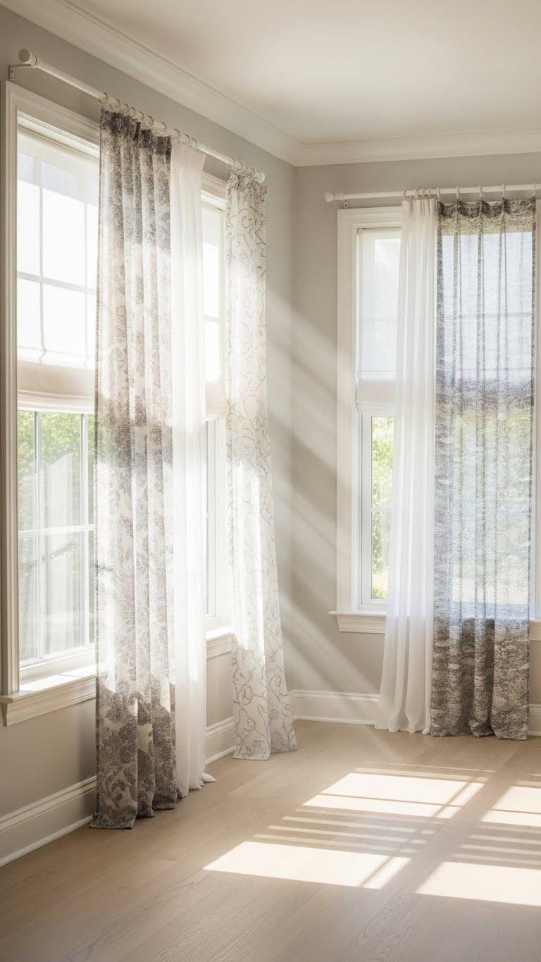 Why not let your windows do the decorating? Swap heavy drapes for minimal voile or printed sheers to soften light and open sightlines. You’ll keep rooms airy while adding subtle pattern or texture that feels effortless.