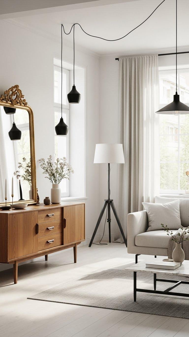 If you want a subtle lift, introduce reflective or light-toned finishes to catch and diffuse daylight without shouting for attention. Choose metallic accents sparingly—thin frames, slender lamps, a mirror—to add gleam without weight.