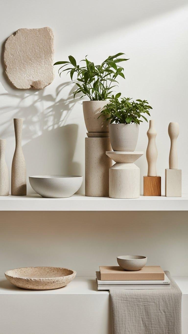 When you edit accessories with intention, a few well-chosen pieces at varying heights give the room rhythm without adding clutter. Choose sculptural objects, a low bowl, and taller greenery on stacked pedestals to create movement. Arrange asymmetrical vignettes on shelves and consoles so each piece breathes. Keep palettes light, materials tactile, and negative space intentional for an airy, liberated feel.