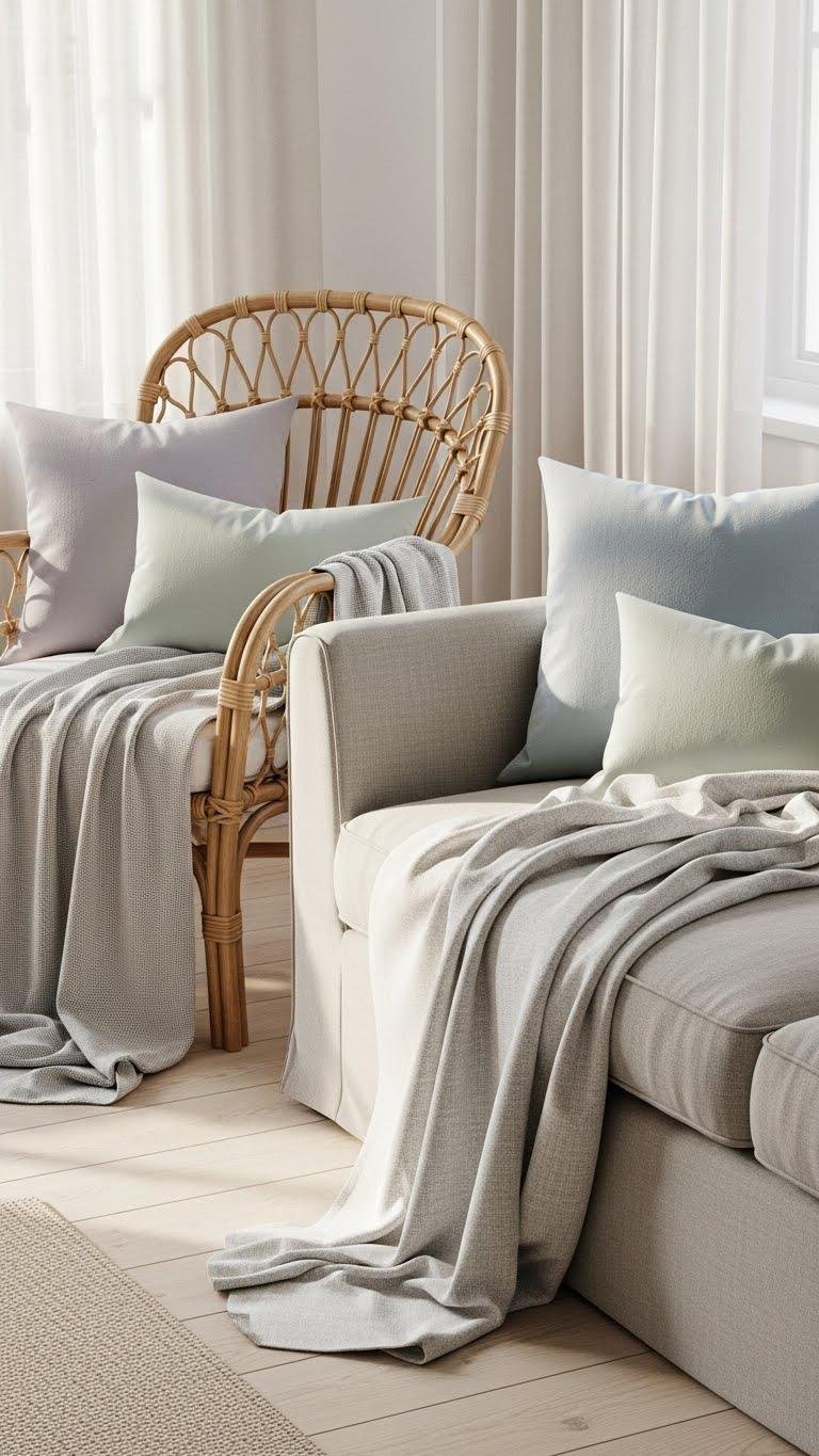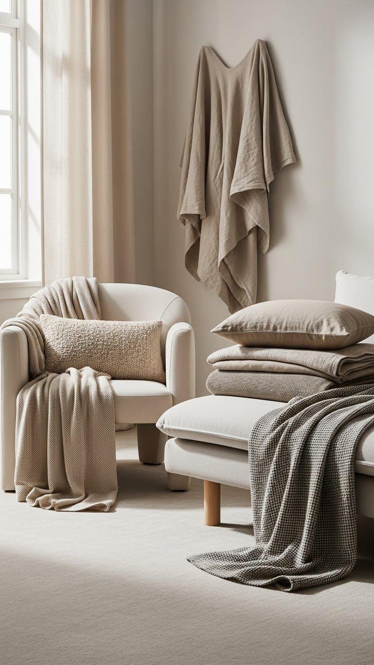 After editing accessories down to a few sculptural pieces, layer textiles to add warmth and depth without weighing the room. You’ll mix textured neutrals—linen throws, boucle cushions—and subtle tonal patterning to create interest without contrast.