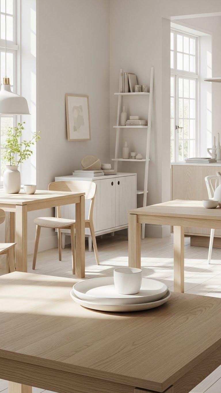 You’ll choose pieces with natural grain, pale oak tables, and bleached cabinetry to keep spaces open.