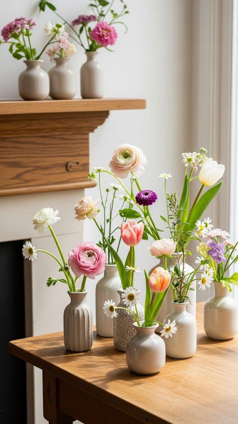 Group Small Vases With Seasonal Blooms on Tables and Mantels