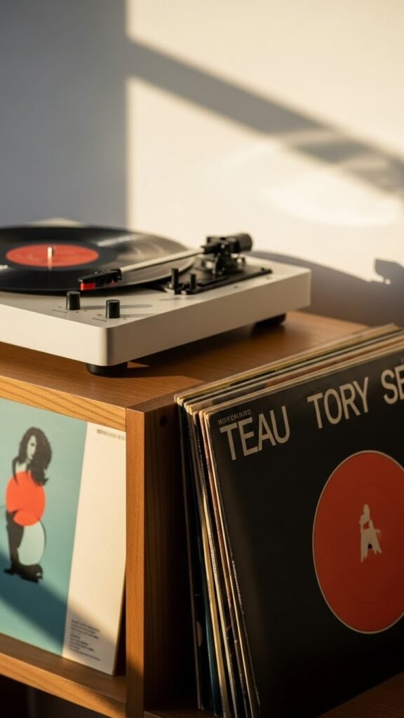 When you stack vinyl records beside a pared-back record player, you get an instant mood—retro warmth meets modern restraint, with spines and sleeve art adding color and rhythm to the shelf.