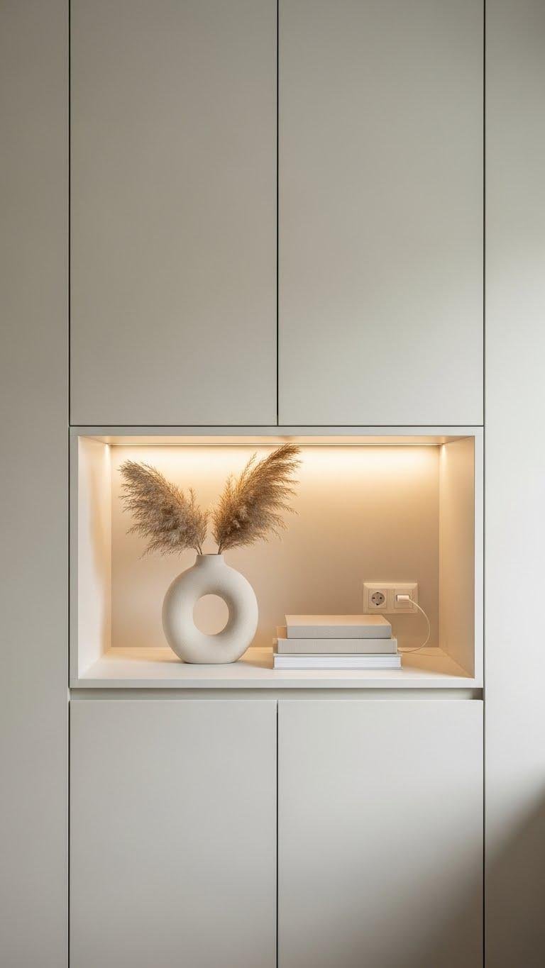 Pair that grounded, tactile vignette with a floating console that’s fitted with concealed lighting to lift the whole composition. You’ll love how under cabinet warmwash lighting sculpts surfaces, creating depth without clutter. Choose sleek floating hardware and hidden brackets for a minimalist, liberated vibe. Keep styling sparse — a single sculptural object and a slim tray — so the glow and clean lines take center stage.