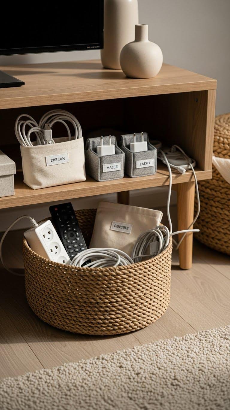 You’ll love the freedom of quick cleanups: use cable baskets for power strips, labeled pouches for remotes, and felt caddies for adapters. Arrange neutrals, tuck cords neatly, and enjoy a minimalist display that’s effortless and personal.