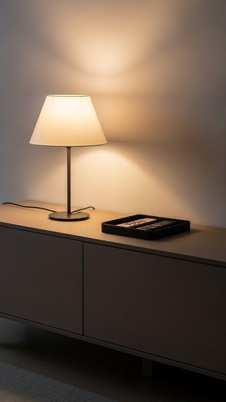 You’ll choose a lamp with a slim silhouette to keep sightlines open and a low-profile tray for tucked organization.