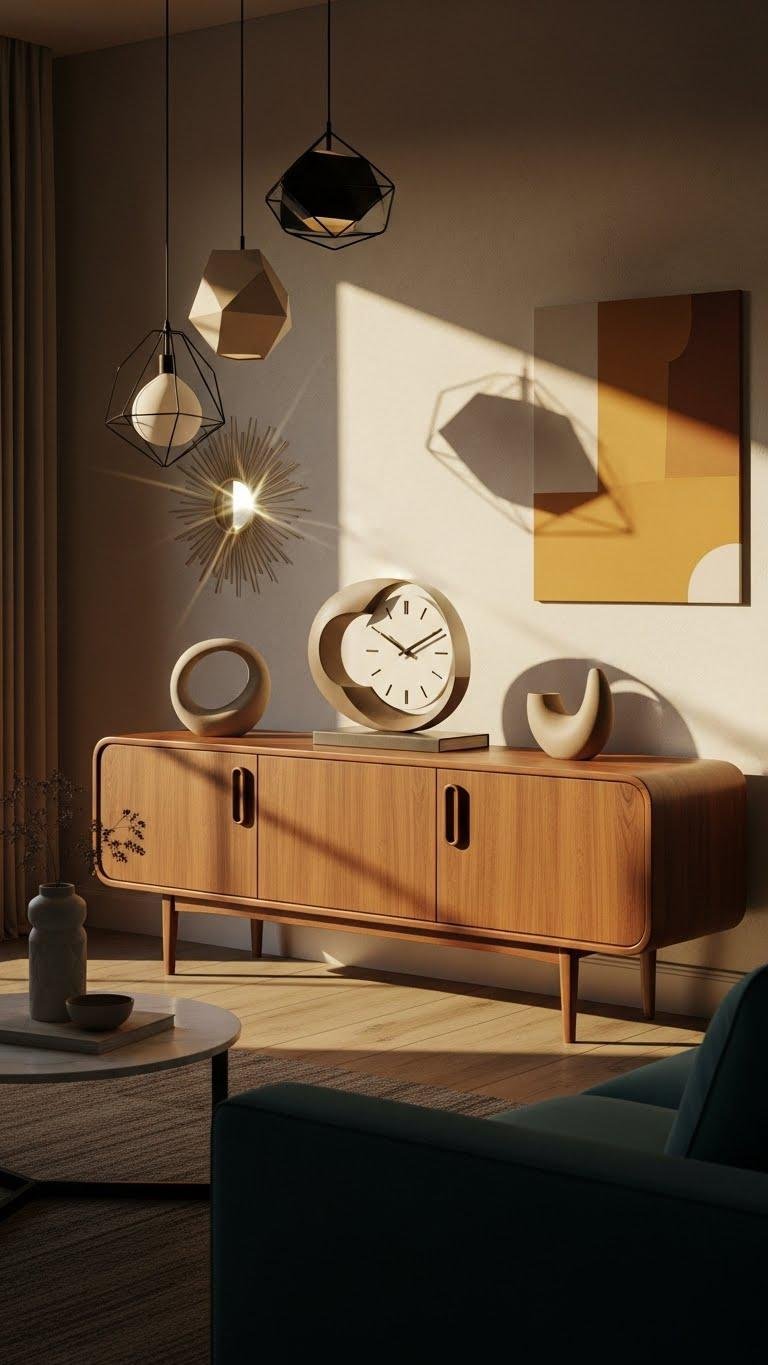 Lean into mid‑century calm with a low console topped by a sculptural clock that reads like art instead of only timekeeping. You’ll pair teak cabinetry and a rounded silhouette for grounded warmth, then contrast sculptural metal forms against geometric pendants overhead. Add a small sunburst mirror to bounce light. The result feels liberated, intentional, and effortlessly cinematic—space that lets you breathe.