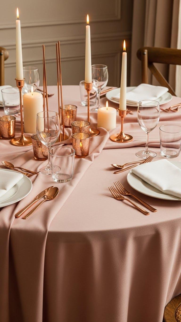 When you drape a soft blush tablecloth over your table, the room instantly feels warmer and more inviting; pair it with rose gold accents and you get a look that’s both romantic and refined.