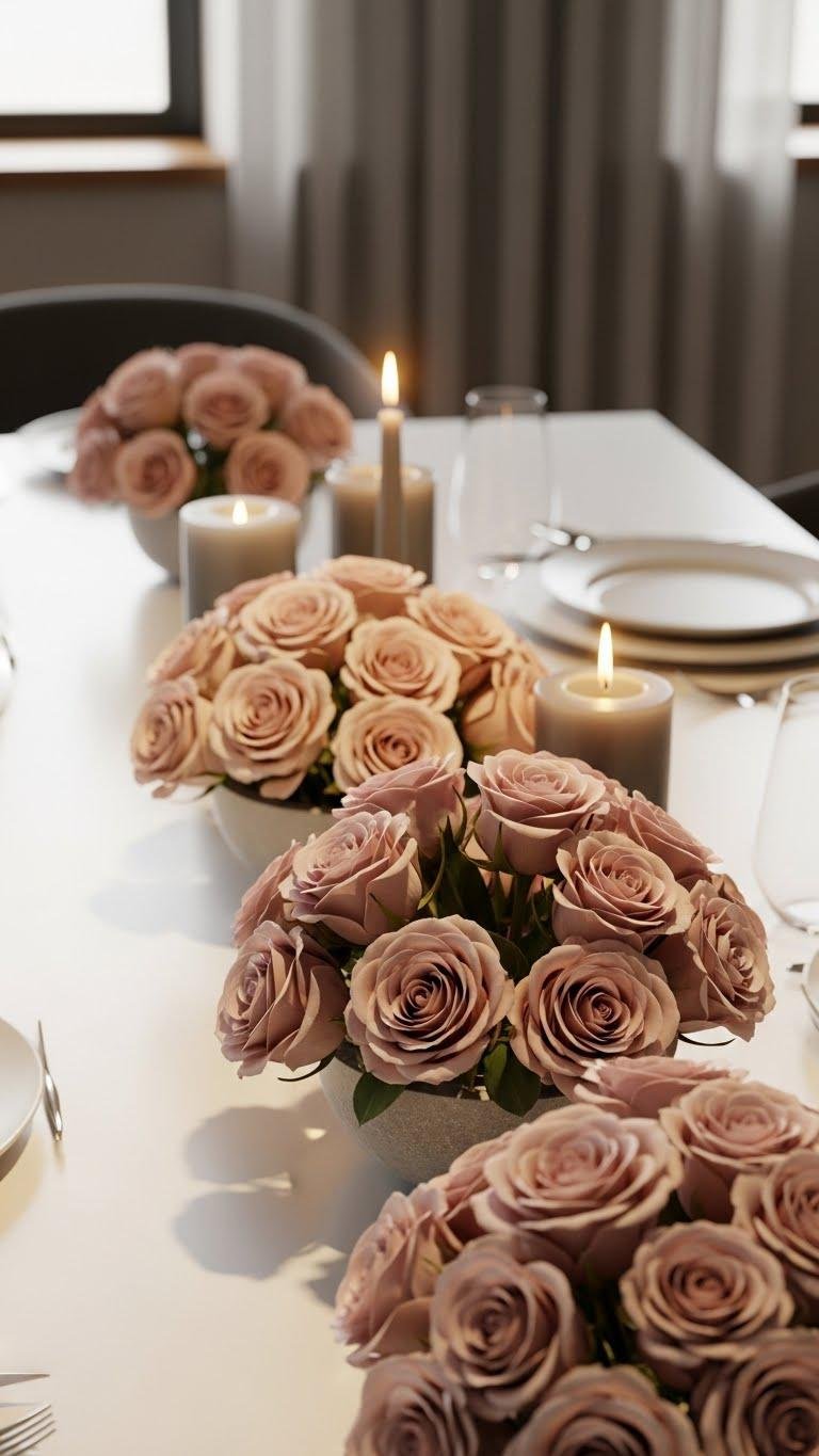 Anchor your table with low monochrome rose centerpieces that feel modern yet intimate. Choose blooms with monochrome petals and muted stems for a restrained, sophisticated look. Place compact clusters in shallow vessels so conversation flows. You’ll create an airy, liberating atmosphere that reads intentional, not fussy. Add matte candles nearby for warm glow without stealing the floral simplicity.