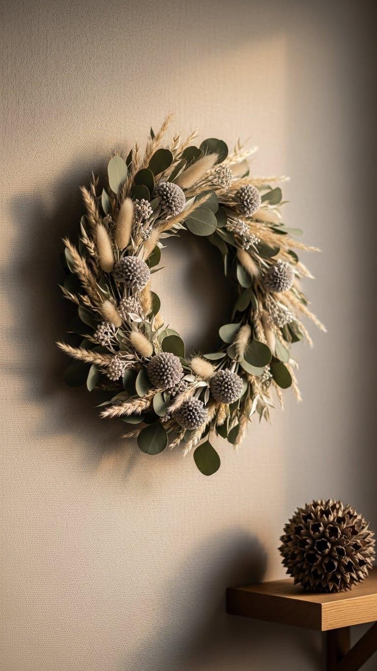 Choose muted palette wreaths with grasses, silver brunia, and gentle eucalyptus; hang it where it breathes. Add a textural seedpods centerpiece nearby for contrast, letting each element feel intentional and free.