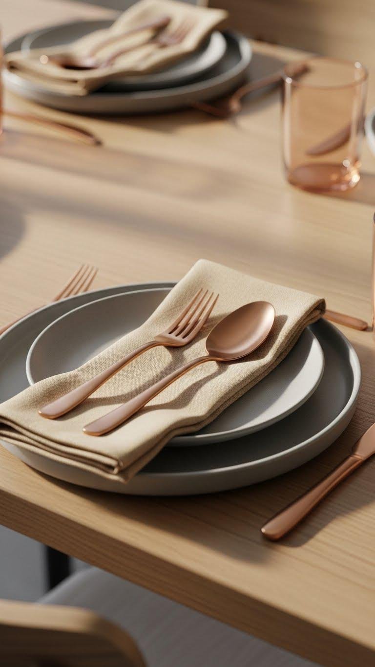 After you’ve let photographs breathe on the wall, carry that same restraint to the table by pairing rose gold flatware with neutral place settings. You’ll choose pieces with a matte finish to feel modern yet soft; treat them like heirloom flatware — simple, respected.