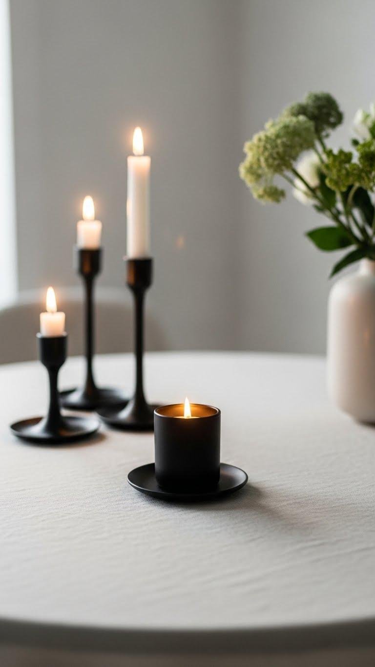 Often a single matte black candle holder will ground a table the way a photograph grounds a wall: it gives contrast, calm, and a focal point. You’ll pair matte contrast with soft linens and muted blooms, letting sleek silhouettes read modern and unfussy. Choose varied heights to create rhythm, light one or three candles, and enjoy a liberated, refined setting without overdecorating.