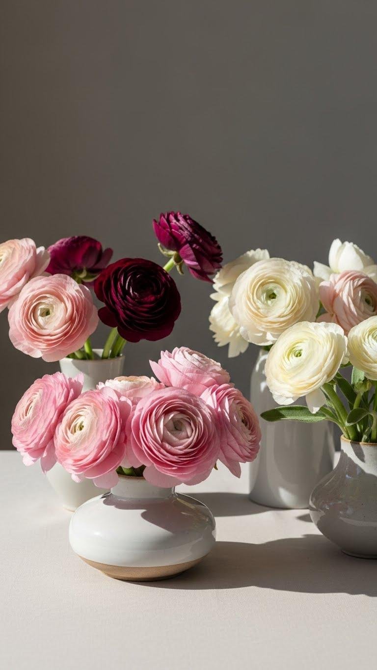 Compact Ranunculus Bouquets in Ceramic Vases