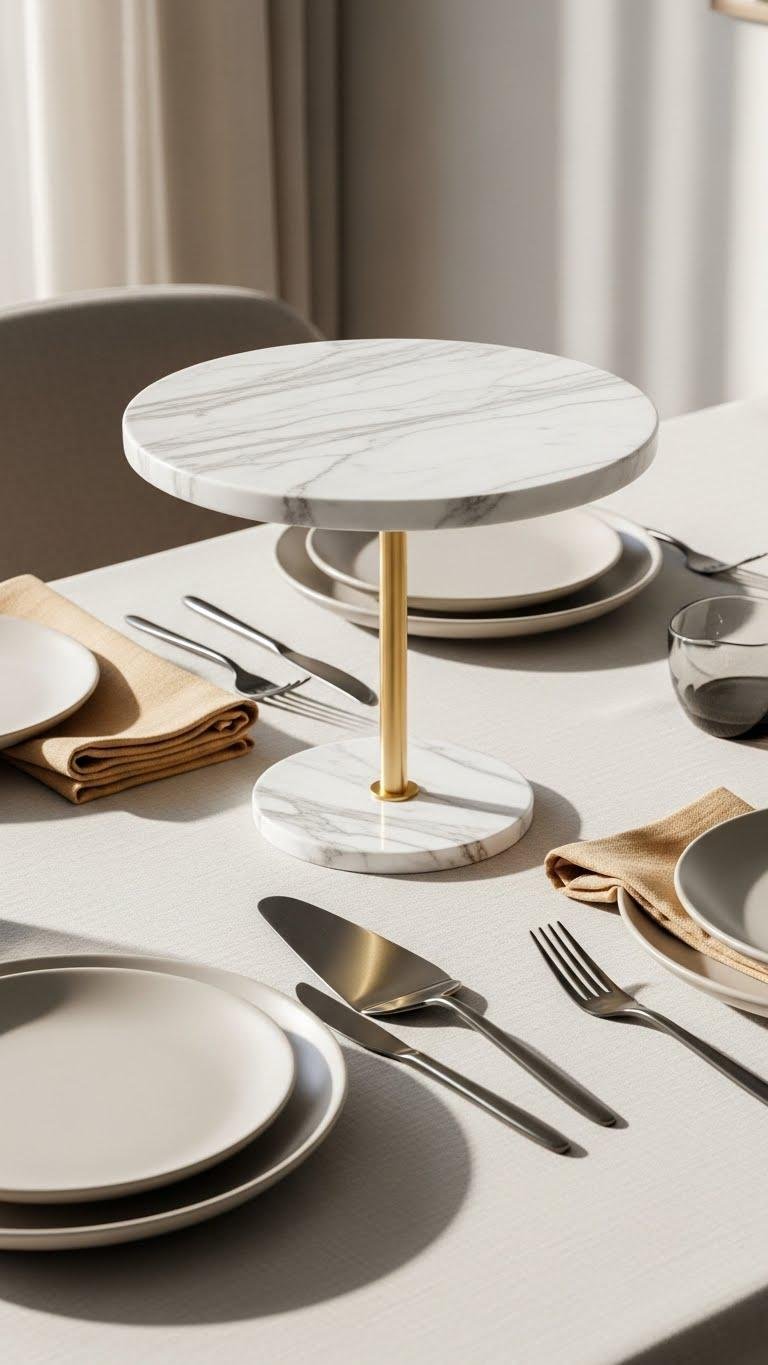 Choose a stand with a marble base for grounding and artful height; pair plates, forks, and cake servers in neutral tones. Finish with matched linens to keep the look curated, free, and effortlessly collected.