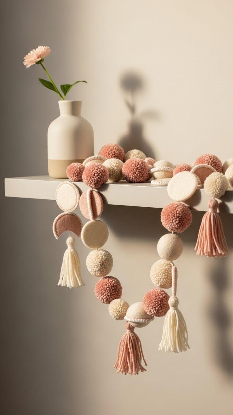 After you’ve given the mantel room to breathe with that single bloom, add a soft, tactile layer along the shelf with a textured felt garland in blush and cream.