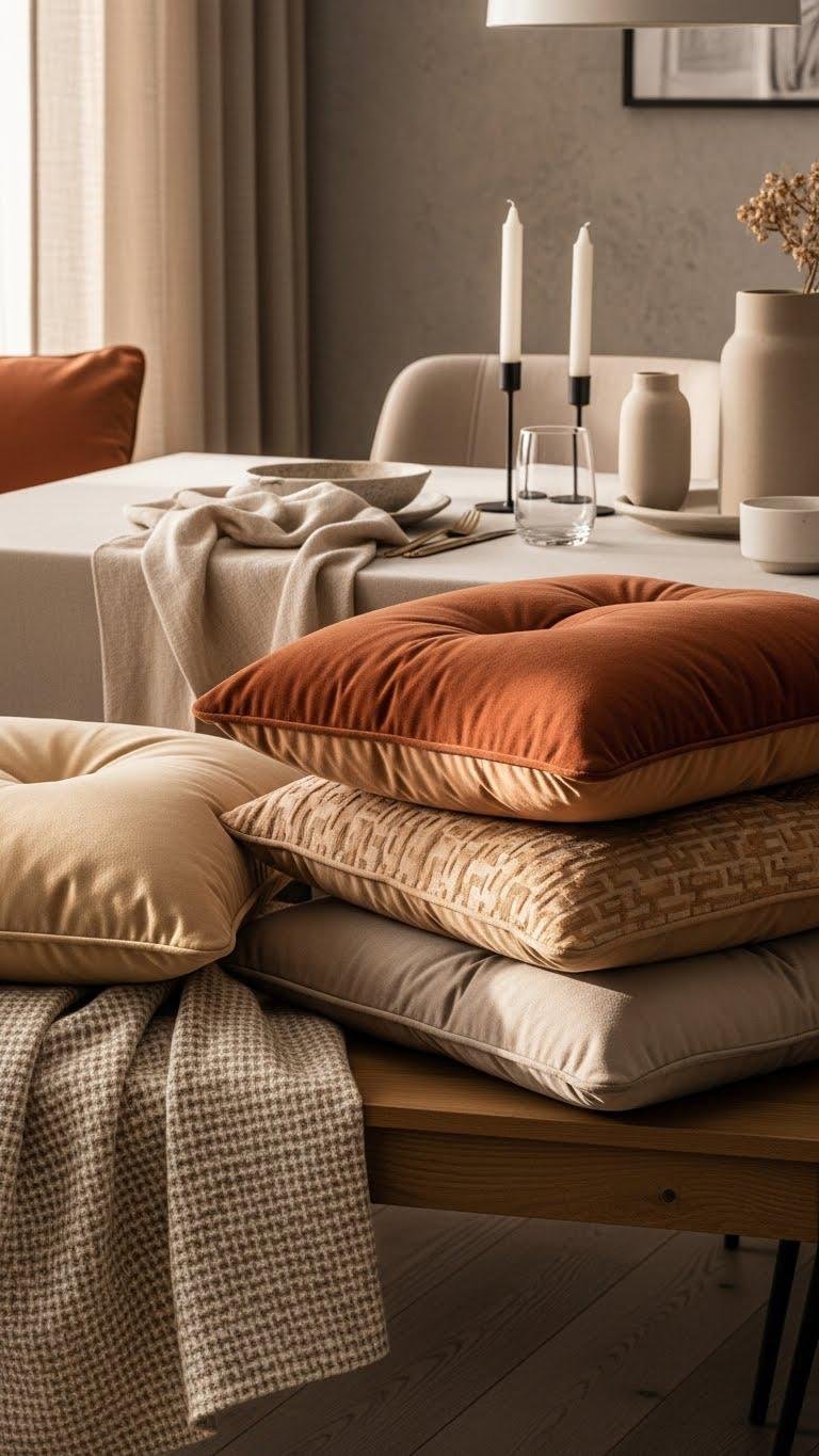 If you want to soften the table’s edges and invite guests to linger, layer a mix of velvet cushions in warm neutrals across seating—think buttery beige, muted terracotta, and soft camel—so each piece feels tactile and deliberate.
