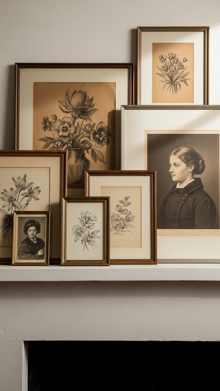 You can give your mantel a quietly nostalgic touch by arranging vintage frames filled with romantic monochrome prints—think soft charcoal sketches, sepia-toned florals, and gentle ink washes. Choose a mix of antique portraiture and delicate sepia lithographs, lean frames, and varied sizes. You’ll create a curated, airy vignette that feels liberated, intimate, and effortlessly elegant without overstatement.