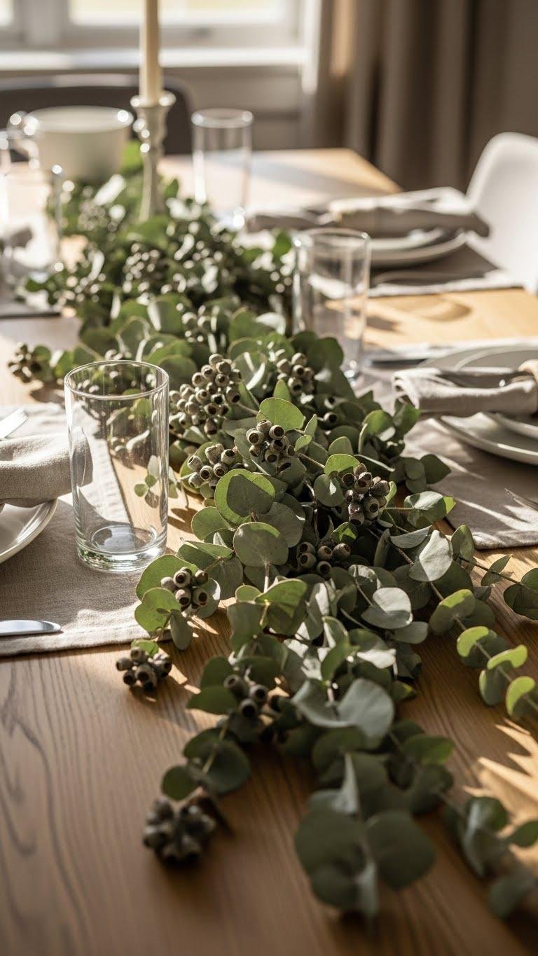 Threading a lush seeded eucalyptus runner down the center of your dining table brings effortless texture and a soft, aromatic presence that’s both refined and relaxed. Let textured eucalyptus spill naturally, pairing a seeded garland with simple place settings and neutral linen. You’ll create an uncluttered, inviting tableau that feels personal and freeing, perfect for intimate conversation and slow, unhurried meals.