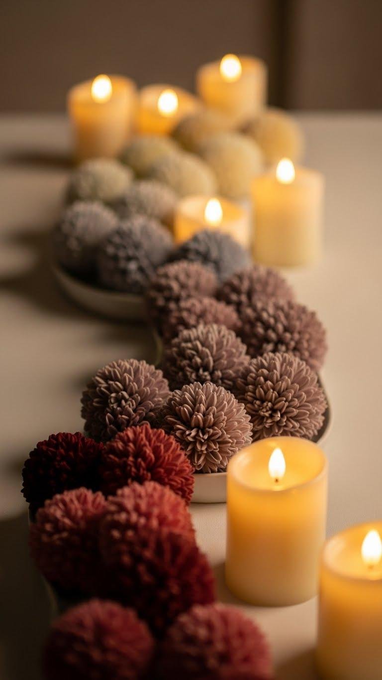 After the warm glow of LED candles sets the mood, bring in soft, sculptural texture with monotone floral balls that create an ombré visual flow across your table. You’ll arrange ombre spheres in graduated hues, letting a restrained floral gradient guide the eye. Choose tactile blooms and matte vessels so your setting feels refined, free, and effortlessly intimate without fuss.