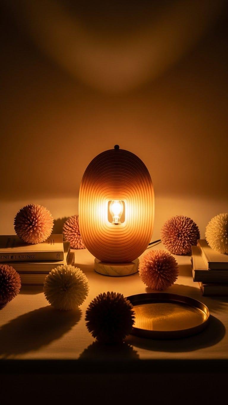 A sculptural table lamp can anchor your vignette and give the ombré floral balls a quiet focal point, casting warm, directional light that sculpts shadow and texture.
