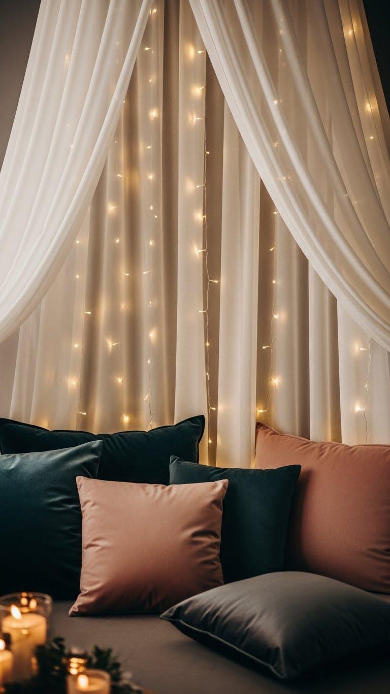 To complement the tactile warmth of velvet cushions, layer in a sheer curtain backdrop threaded with micro LED strands to give the space a soft, luminous frame. You’ll craft a subtle sheer canopy and twinkle curtain that feels liberated, not staged. Drape a micro‑led veil as an ambient backdrop, keeping lines clean, colors muted, and lights dimmed for intimate, effortless romance.