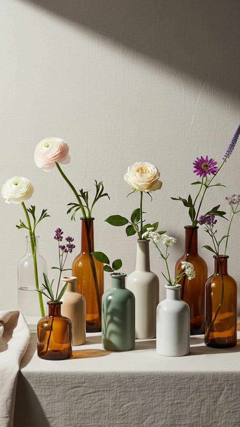 Arrange antique bottles and matte ceramics in varied heights, each holding a single bloom with tapered stems. You’ll create a deliberate, airy rhythm that feels liberated and refined, inviting quiet conversation without overwhelming the space.