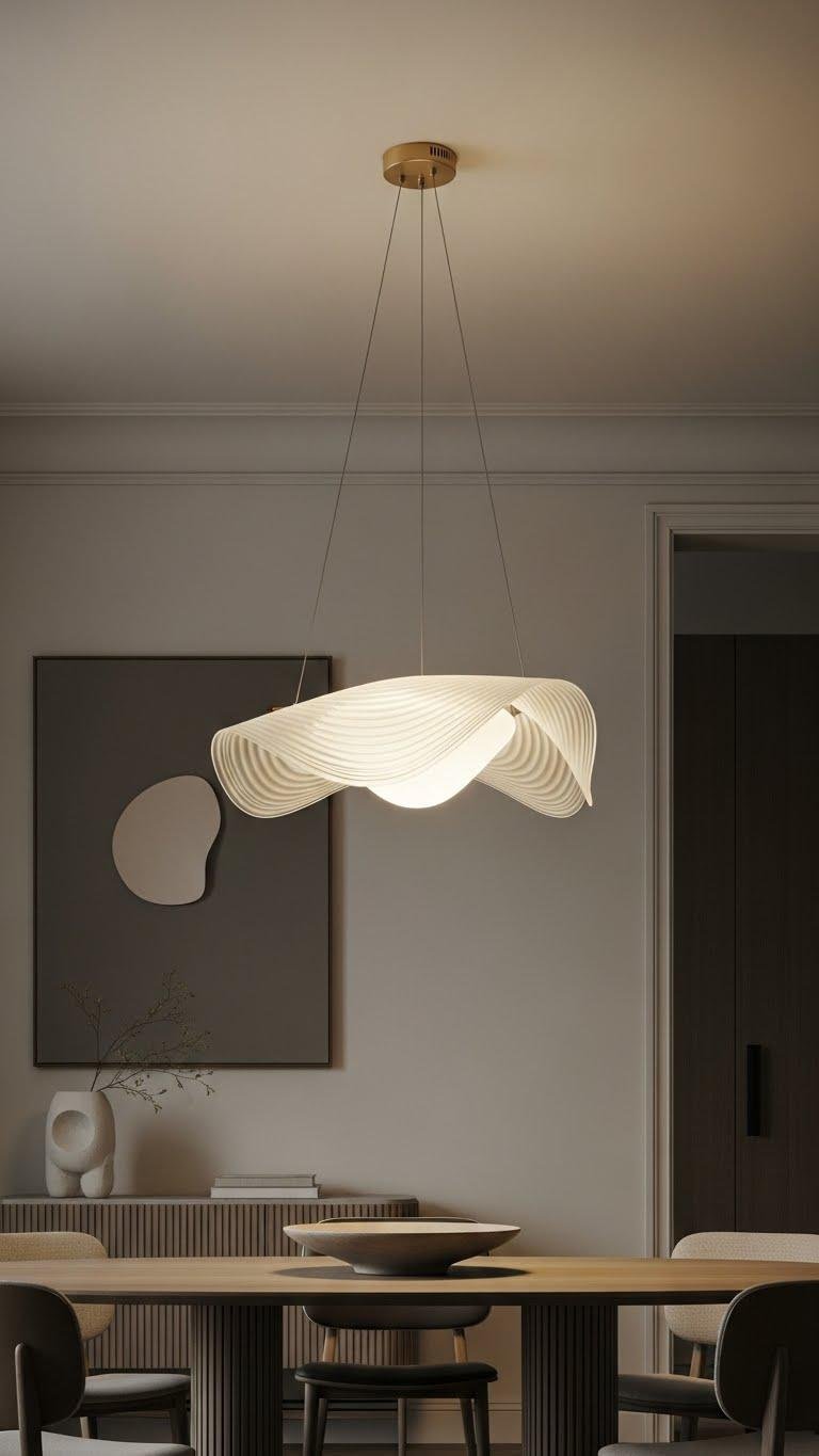 Choose sculptural silhouettes that feel airy yet intentional, and balance pendant proportions with the table or seating below.