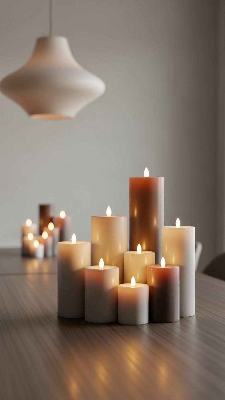 Clustered battery LED candles create a warm, flickering focal point without the worry of open flame, and arranging them at varied heights adds instant depth and rhythm to your table.